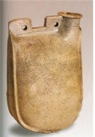 扁體高身,管狀口,唇沿,馬鞍狀雙孔系,小圓底內(nèi)凹;野状商杂布氈拢┌子,釉色泛灰。腹兩側(cè)邊緣飾貼皮頁縫合裝飾,兩側(cè)面刻劃相同的卷草紋,繞雙孔外劃旋渦紋,刻劃線條流暢飄逸,作工精細?梢曌鬟|代雙孔扁身雞冠壺標(biāo)準(zhǔn)器。
