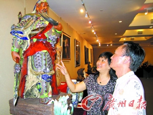 佛山陶瓷工藝大師楊銳華創(chuàng)作的藝術(shù)陶瓷作品《忠義天神》近日在廣東傳統(tǒng)工藝美術(shù)精品大展上獲得金獎(jiǎng)。該作品運(yùn)用中國(guó)傳統(tǒng)衣紋表現(xiàn)手法,結(jié)合西歐城雕表現(xiàn)方法,取用簡(jiǎn)練線條,高度概括衣紋、精雕細(xì)刻甲紋服飾,產(chǎn)生一種對(duì)比強(qiáng)烈的效果。再加上釉上配搭“藍(lán)綠均釉”與“華紅釉”對(duì)比度強(qiáng)而又統(tǒng)一協(xié)調(diào)有變化。圖為《忠義天神》在展出。(記者 黃建華 攝)