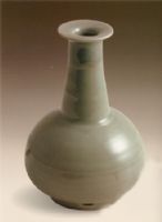 口沿平坦,直頸向下漸漸放開,頸部飾以兩道弦紋,鼓腹下垂,腹部飾弦紋一周,矮圈足,圈足側(cè)開有扁孔,釉色瑩潤(rùn)欲滴,為純正的梅子青,此器不失為南宋龍泉窯之佳品。