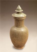 此瓶是比較典型的北宋中期龍泉窯產品。釉色青中帶黃,瓶體布滿暗刻花卉紋,豐肩,平底,底心略凹,瓶頸粗壯,幾乎變成直口。瓶蓋造工精細,刻有細致的蓮瓣紋,蓋鈕如含苞待放的蓮花。