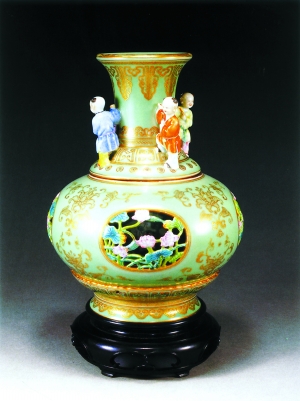 雍正、乾隆兩朝的官窯瓷器,嬰戲圖畫工嚴(yán)謹(jǐn),多見兒童衣紋清晰,眉清目秀,動(dòng)作天真爛漫,惹人喜愛。用嬰戲圖描繪了“黃發(fā)垂髫并怡然自得”的桃園美景和太平盛世。當(dāng)時(shí)的官窯瓷器嬰戲中的兒童姿態(tài)多樣,動(dòng)作夸張,畫面多呈熱鬧愉悅的氣氛。