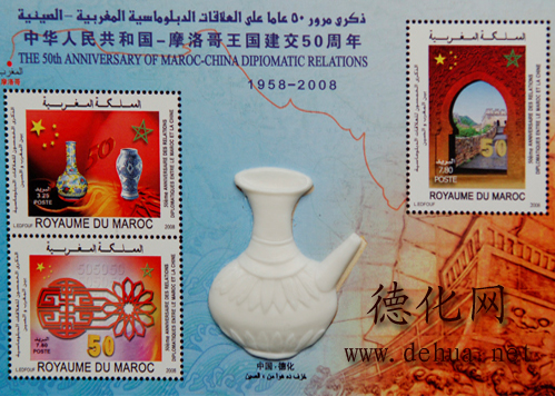為了紀(jì)念中摩建交50周年,體現(xiàn)兩國之間的傳統(tǒng)友誼,摩洛哥郵政部門即將發(fā)行《中國與摩洛哥建交50周年》紀(jì)念郵票、絲綢鑲瓷小全張。這枚郵票由我國印制,該郵票圖案體現(xiàn)中國和摩洛哥兩國的獨(dú)有特色,選用中國瓷都德化白瓷鑲嵌于絲綢之上,并勾畫當(dāng)年由摩洛哥到德化“海上絲綢之路”的路線,是世界首枚絲綢鑲瓷郵票小全張。