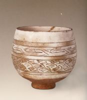 缽圓口內(nèi)斂,深腹、底為圈足。釉下施有一層白色化妝土,施釉不到底。口下刻劃有一周連續(xù)的云雷紋,其下飾有呈帶狀的刻劃幾何紋。