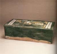 枕面兩側刻有詩一首:[閨中少婦不知愁,春日凝妝上翠樓。忽見陌頭楊柳色,悔教夫婿覓封侯。]枕中心依詩意刻劃人物圖案;胎色灰白、通體施黃、綠、白三色釉;枕面詩后有[隆興紀元春二月張沖珍玩]款,底有[張家造]戳印。