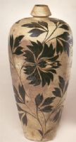 造型端莊古樸,是當時盛酒用具,為磁州窯較常見的造型之一。通體以白地黑花為飾,繪有折枝花卉兩組,紋飾筆酣墨暢,濃重灑脫,花葉肥大,線條流暢舒展,構圖疏密勻當,體現(xiàn)了磁州窯簡練而又生動的裝飾風格。此瓶具有極高的藝術價值和研究價值。