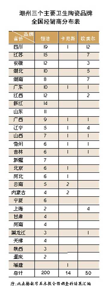 我們調(diào)查了潮州幾個(gè)較大規(guī)模的衛(wèi)生陶瓷品牌的全國(guó)經(jīng)銷商分布情況,包括恒潔、歐美爾、卡尼斯、法恩斯、夢(mèng)佳等。在本報(bào)所掌握的全國(guó)9430個(gè)衛(wèi)生陶瓷經(jīng)銷商中,經(jīng)營(yíng)潮州品牌的經(jīng)銷商只有269個(gè),渠道占有率僅為2.85%。其中法恩斯80%以上產(chǎn)品外銷,夢(mèng)佳今年才計(jì)劃做內(nèi)銷,在全國(guó)的經(jīng)銷商網(wǎng)點(diǎn)均不到五個(gè)。