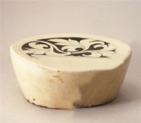 枕呈扁圓形,面大底小,枕底內(nèi)凹。施白釉,略泛黃色,有小開片。底少部份涮醬釉,胎泛淺紅色。枕面呈半月形裝飾區(qū)繪黑地白花折枝牡丹,圖案簡練,別具一格,很富裝飾效果。