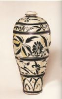 瓶小口,短頸,圓肩,上部豐滿,腹下漸斂,寬圈足,俗稱梅瓶。瓶身白地黑彩,上下共有四道弦紋,中間繪以花卉紋及變形焦葉紋,素底無釉。