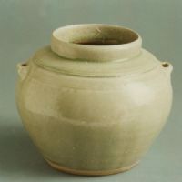 直口,圓唇,斜肩,圓球腹,平底內(nèi)凹,肩部置對稱二系并弦紋二道,釉不及底,少許開片.
