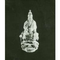 該像束發(fā)頂髻,面容慈安,身著寬袖長袍,腳穿云頭高履,端座山石.旁塑有仙鶴一只,老者手執(zhí)蕉葉扇.釉色青綠,瑩潤光亮,臉部、胸露赭紅色。
