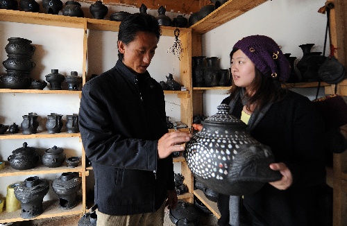 10月27日,尼西鄉(xiāng)湯堆黑土陶手工藝人當(dāng)珍批初(左)在自家店鋪中向客人介紹黑土陶的特點(diǎn)。 近年來,云南省迪慶藏族自治州香格里拉縣尼西鄉(xiāng)利用良好的自然條件及特有的傳統(tǒng)手工藝技術(shù),積極發(fā)展生態(tài)雞養(yǎng)殖與黑土陶燒制等特色產(chǎn)業(yè),使“尼西雞”和“尼西黑土陶”成為云南省的知名特色產(chǎn)品,讓已參與其中的500多戶農(nóng)戶每戶每年增收超過萬元,有效推動(dòng)了當(dāng)?shù)匾恍┎刈迦罕姷拿撠氈赂弧?/p>