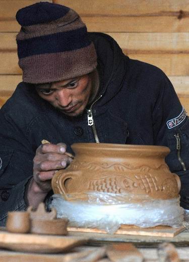 10月27日,尼西鄉(xiāng)湯堆的一位手工藝人正在制作黑土陶器皿。 近年來,云南省迪慶藏族自治州香格里拉縣尼西鄉(xiāng)利用良好的自然條件及特有的傳統(tǒng)手工藝技術(shù),積極發(fā)展生態(tài)雞養(yǎng)殖與黑土陶燒制等特色產(chǎn)業(yè),使“尼西雞”和“尼西黑土陶”成為云南省的知名特色產(chǎn)品,讓已參與其中的500多戶農(nóng)戶每戶每年增收超過萬元,有效推動(dòng)了當(dāng)?shù)匾恍┎刈迦罕姷拿撠氈赂弧?/p>