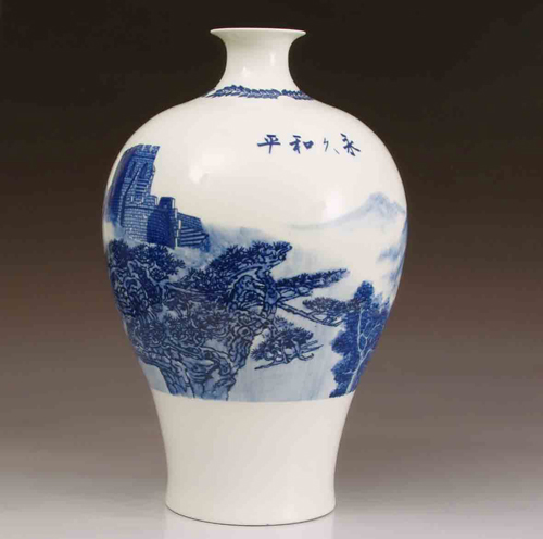 隨后,筆者又再次前往珠山畫院,負(fù)責(zé)人顧先生非常熱情地接待了筆者,同時(shí)帶領(lǐng)筆者參觀了“永久和平”國(guó)禮青花瓷的展廳,并給筆者展示了國(guó)家博物館頒發(fā)的蓋有原章的鑒定證書和收藏證書。林先生告訴記者:“景德鎮(zhèn)建鎮(zhèn)到今年已有1004年了,千年瓷都需要一個(gè)機(jī)會(huì)來向世人展示千年的風(fēng)貌和千年精湛的技藝。我們用最本色的精品瓷器來打造“國(guó)禮”,這是珠山畫院的榮耀更是責(zé)任。“永久和平”代表中國(guó)走向世界,必須體現(xiàn)中國(guó)當(dāng)代青花瓷的最高瓷藝水平,決不容許任何有瑕疵的瓷瓶存在。所以將制造過程中出現(xiàn)的次優(yōu)品和殘次品全部銷毀,嚴(yán)防哪怕一片碎瓷外流。我們要從這一款精品瓷做起,讓千年瓷都的發(fā)展在步入一個(gè)新的千年的時(shí)候,同時(shí)步入一個(gè)更高行業(yè)標(biāo)準(zhǔn)的新臺(tái)階。”