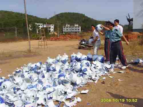 筆者不禁問珠山畫院工作人員,為什么要當(dāng)即砸毀?砸了不可惜嗎?他告訴筆者:“這批入庫(kù)的產(chǎn)品有200多件,都是次優(yōu)品,國(guó)家用瓷辦公室有嚴(yán)格規(guī)定,絕對(duì)不能讓任何一件國(guó)禮青花次優(yōu)品流通到市場(chǎng)里去。當(dāng)即砸毀也許正是為了給人敲個(gè)警鐘吧!但是這里也有很多制瓷工人的心血,就像是自己的孩子,砸了不少人也會(huì)感到可惜。” 他告訴筆者,為嚴(yán)防像此類事件再度發(fā)生,在截回并砸毀這兩只青花瓷后第二天,也就是19日上午,廠里就把本批次所有次優(yōu)品悄悄運(yùn)到東郊全部銷毀了。這和筆者從村民處獲知的時(shí)間完全吻合。