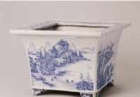 盆呈長方形,折沿口,委角,深壁,平底下承四如意形足,底有圓孔,青花紋飾,折沿上繪松、竹、腹四面分別繪山水人物圖,內(nèi)含有“一帆風(fēng)順”、“指日高升”等吉祥畫意。