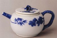 壺扁圓形,竹節(jié)形流,松樹(shù)枝干形執(zhí)柄,平頂蓋,梅枝形鈕。器身通景青花飾折枝松、竹、梅紋。底青花書(shū)“大清康熙年制”六字楷書(shū)款。