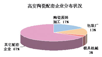 高安原來的陶瓷配套產(chǎn)業(yè)并不完善,生產(chǎn)所需的各種配料很多都要從佛山、福建等地運(yùn)來。近兩年,隨著高安陶瓷產(chǎn)業(yè)自身不斷壯大的同時(shí),也帶動(dòng)著相關(guān)行業(yè)的快速發(fā)展。伴隨著陶瓷產(chǎn)業(yè)的發(fā)展和升級(jí),陶瓷原料,色釉料、機(jī)械、模具、耐火材料、運(yùn)輸?shù)扰涮桩a(chǎn)業(yè)水平快速提升,均已實(shí)現(xiàn)了專業(yè)化。截至2008年5月,全市擁有陶瓷配套企業(yè)超過155家,其中陶瓷原料加工企業(yè)25家,陶瓷模具及機(jī)械制造廠5家,包裝廠20家,經(jīng)營(yíng)陶瓷原材料、機(jī)械配件、陶瓷產(chǎn)品的個(gè)體工商戶100多個(gè),擁有各類營(yíng)運(yùn)車輛1萬多輛。