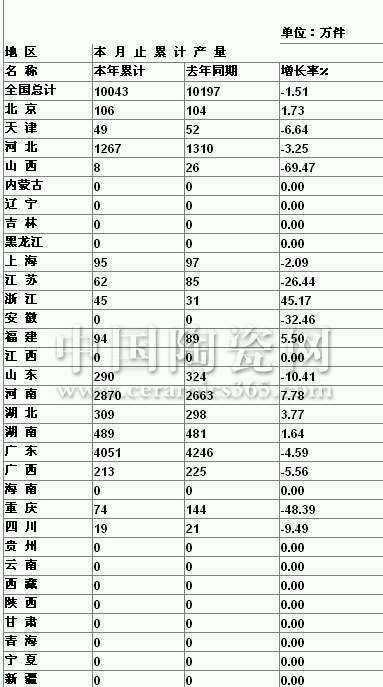 2008年1-8月全國分地區(qū)衛(wèi)生陶瓷累計產量
