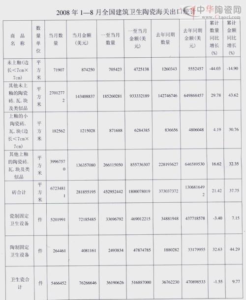 2008年1-8月全國衛(wèi)生陶瓷海關(guān)出口統(tǒng)計(jì)