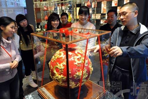 這是消費(fèi)者在觀看千窯一寶“富貴紅”大花瓶(11月14日攝)。