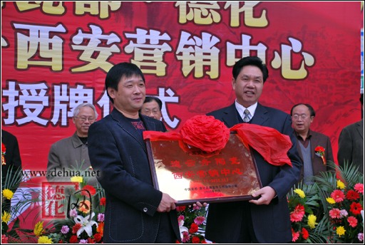 德化瓷向以白瓷著名,被譽(yù)為“東方藝術(shù)”、因而“天下共寶之”。 德化瓷塑以中國(guó)白為材質(zhì),瓷塑造型、技藝、材質(zhì)、釉色、燒制技藝自成特色。為進(jìn)一步解讀、詮釋當(dāng)代德化瓷藝術(shù)經(jīng)典,促進(jìn)德化瓷藝術(shù)的傳承、創(chuàng)新和發(fā)展。經(jīng)精心籌備,中國(guó)瓷都·德化——迪云州陶瓷西安營(yíng)銷(xiāo)中心,于11月15日在西安正式授牌,開(kāi)業(yè)迎賓。這是瓷都德化精品陶瓷的集中全面展示,也是德化與西安兩地?cái)y手合作、共促發(fā)展的一個(gè)良好的窗口。