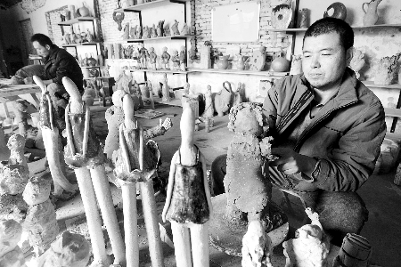 李紅斌從小就喜歡捏各種泥人,后來考上了河南師范大學(xué)的美術(shù)專業(yè),打理生意之余,為了有地方能夠致力于自己的陶藝,他在石佛村特意租了這個地方制作作品,還有朋友替他做了陶窯。他的屋子里擺了上千部作品,有事沒事,他就會來到這里,讓腦子中的形象變成活生生的陶瓷物品,其中他最滿意的作品就是“黃河老漢”:叼著煙斗的老農(nóng)民、手扶拐杖的老農(nóng)民……他說,從小生長在鄭州農(nóng)村,小時候那些景象讓他印象深刻,用雙手做出來,似乎是“回到小時候的美好時光”。而他只有6歲的小兒子,也在耳濡目染之下做成了可愛的陶瓷“奧特曼”、“小飛機(jī)”,他們家里的藝術(shù)品大多是自己做成的。李紅斌說,他的作品不準(zhǔn)備出售。
