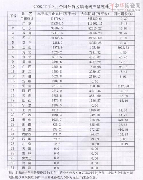 2008年1-9月全國分省區(qū)墻地磚產(chǎn)量統(tǒng)計(jì)