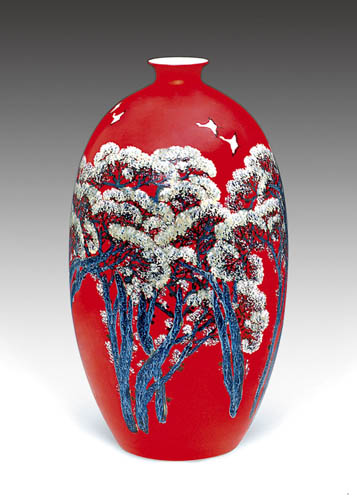 景德鎮(zhèn)高溫顏色釉有兩種,一種為高溫單色釉,一種為高溫窯變顏色釉。在陶瓷裝飾材料中,亮麗、穩(wěn)定的高溫紅色釉和高溫窯變顏色釉是目前材料工藝美的“頂級”。而寧勤征的作品,用高溫單色釉和窯變花釉復(fù)合堆畫于高溫紅色底釉上進(jìn)行裝飾,則是科學(xué)與藝術(shù)的完美結(jié)合,是藝術(shù)、技術(shù)、材料工藝結(jié)合上的一種突破。