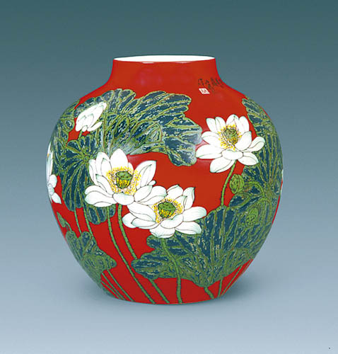 高溫中華紅顏色釉《荷香滿塘》瓷瓶