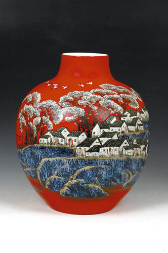 “景德鎮(zhèn)是千年瓷都,瓷都人一定能造出比他們更好的藝術(shù)陶瓷來!”從杭州回來之后,寧勤征就暗暗憋足了一口氣,開始查詢各種資料。他發(fā)現(xiàn)景德鎮(zhèn)藝術(shù)陶瓷中,除了在燒制好的白瓷胎上以釉上顏色釩紅、珊瑚紅作為底色,然后進(jìn)行繪畫裝飾的藝術(shù)陶瓷之外,確實(shí)還沒有直接用高溫釉料在高溫紅底釉上作裝飾、一次燒成的藝術(shù)陶瓷。景德鎮(zhèn)的祭紅、郎紅釉也只能在燒制好的瓷器上進(jìn)行釉上彩繪。
