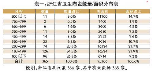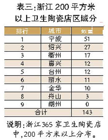 從陶瓷店數(shù)量/面積分布表可以看出(見表一),參與調(diào)查的365家衛(wèi)浴陶瓷店中,200平方米以上陶瓷店數(shù)量占比40%,面積占比則達到近70%,而800平方米以上陶瓷店共有11家,主要分布在寧波、紹興和衢州。