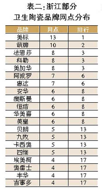 從衛(wèi)浴品牌的分布來看(見表二),美標(biāo)、科勒、卡西奧、漢斯格雅等國際品牌在浙江地級市場的力度明顯加大,美標(biāo)超過箭牌3個網(wǎng)點的數(shù)量而躍居第一,分布在金華、寧波、麗水、紹興、臺州等地級市場。