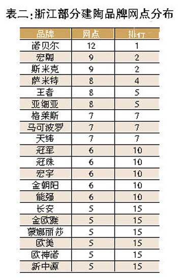作為浙江本地品牌,諾貝爾在自己的家門口以絕對優(yōu)勢壓過其它品牌而位居網(wǎng)點排行的首位。而上海品牌斯米克、亞細(xì)亞也打破在其它地區(qū)的尷尬境地,在浙江的二、三級市場嶄露頭角,與佛山品牌一決高下。