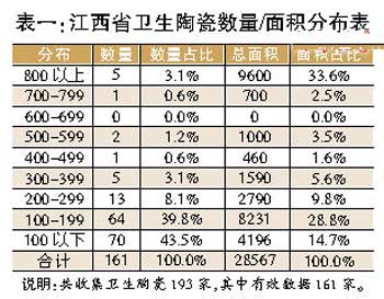 在江西二、三級市場中,安華、阿波羅衛(wèi)浴超越其它品牌成為市場亮點。而箭牌則在江西地級市場略顯不足,僅分布在上饒、新余、九江和吉安,其它地市則難尋蹤影。而從衛(wèi)生陶瓷數量/面積占比看(見表一),在參與調查的161家衛(wèi)浴店中,200平方米以下經營面積數量占比超過80%,占市場主流。