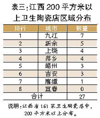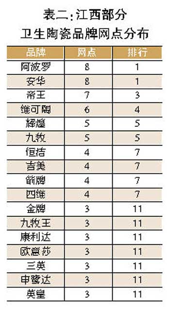 從衛(wèi)浴品牌的網點分布來看(見表二),九江、新余是衛(wèi)浴品牌在江西地級市場的發(fā)力點。據了解,雖然新余的建陶市場今年受環(huán)境影響較大,但衛(wèi)浴市場則表現平穩(wěn)。