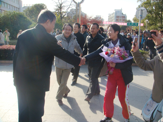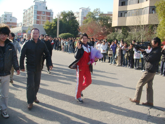 景德鎮(zhèn)在線訊:12月5日下午,北京奧運(yùn)會(huì)女子49公斤級(jí)跆拳道冠軍吳靜鈺和家人、教練,景德鎮(zhèn)市體育局領(lǐng)導(dǎo)一行來陶瓷學(xué)院參觀,受到了學(xué)校黨委書記肖任賢等校領(lǐng)導(dǎo)和數(shù)百名師生的熱烈歡迎。學(xué)生代表向吳靜鈺敬獻(xiàn)了鮮花,并一致表示“向奧運(yùn)冠軍致敬,向奧運(yùn)冠軍學(xué)習(xí)”。