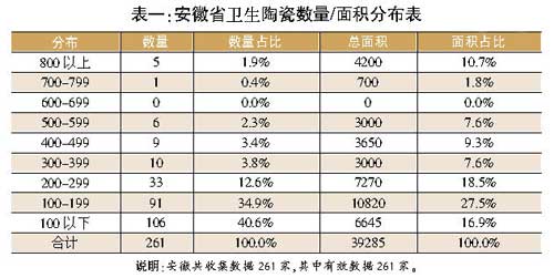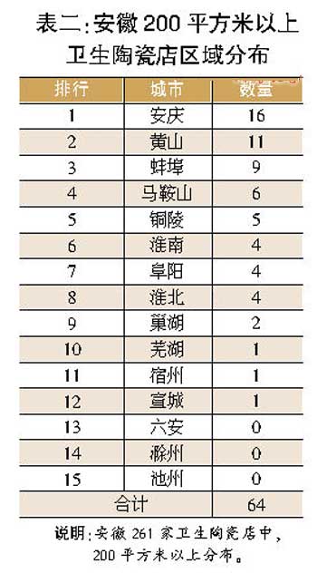 在安徽地級(jí)市場(chǎng)中,恒潔、惠達(dá)、吉事達(dá)、英皇、申鷺達(dá)等衛(wèi)生潔具品牌都有網(wǎng)絡(luò),雖然網(wǎng)點(diǎn)不多,但品牌影響力在這些地級(jí)市場(chǎng)中仍不可小視。在調(diào)查的261家衛(wèi)生陶瓷店中,100-200平方米經(jīng)營(yíng)面積數(shù)量占比近50%(詳見表一),成為地級(jí)陶瓷店的主流,馬鞍山、安慶、蚌埠、黃山等地的衛(wèi)生陶瓷店面積普遍較大,其中,就200平方米以上經(jīng)營(yíng)面積看(詳見表二),安慶仍居首位,黃山尾隨其后。而滁州、池州的衛(wèi)生陶瓷店與建陶店一樣,仍多以較小面積為主。