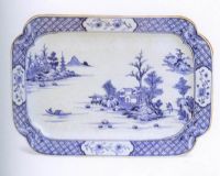 盤心內(nèi)青花描繪水面風(fēng)景,一個人蕩舟于水上,另一個漫步在小橋上,配以遠山近水和房屋、寶塔。構(gòu)圖虛實相間,用筆濃淡相宜。