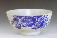 碗撇口,深腹,圈足,碗內(nèi)光素,碗外壁青花繪折枝花卉,造型規(guī)整,是外銷瓷中的上品。