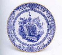 釉下青花,醬口,邊緣有羅柯柯花紋,以錦地劃隔四朵花卉,盤心內(nèi)飾以花草云朵,中心畫以瑞典市民格雷(從未被寺為貴族)的紋章。