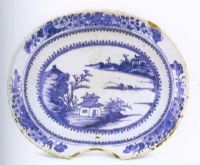 器物呈橢圓,口沿有半圓缺口,裝飾三組卷草花卉圖案,中心圖案為青花山水。此盆為男性刮胡須所用。