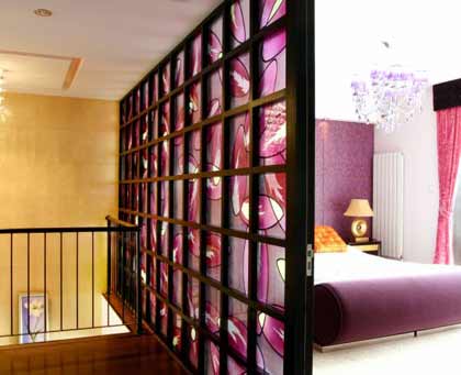 案例中,樓梯間與臥室相鄰,因?yàn)闃翘蓍g沒有窗戶,因此采光受到了很大影響。將原有的臥室墻面改造成一面玻璃隔斷,這個問題便迎刃而解了。紫色花紋的玻璃隔斷不僅與臥室主色調(diào)相一致,并且將臥室窗外的光線“引進(jìn)”到了樓梯間,讓此處的采光效果得到了極大改善。