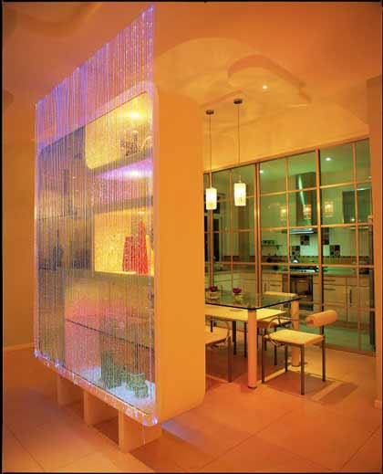 展示架也非常適合用來劃分客廳和餐廳空間。在這個(gè)案例中,充滿時(shí)尚、動(dòng)感造型的展示架不著痕跡地發(fā)揮著自己的分隔作用,同時(shí),又能與被分開的兩個(gè)空間完美融合,不顯突兀。為了增強(qiáng)裝飾效果,帶有發(fā)光效果的線簾也被運(yùn)用了進(jìn)來,讓這處空間充滿了設(shè)計(jì)感,顯得新穎而獨(dú)特。
