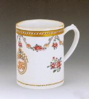 杯子呈直桶形,有環(huán)形手柄,以釉上彩和金彩繪以歐洲風格圖案,圍繞開光內有字母IH。