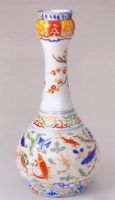 瓶為蒜頭口,長(zhǎng)頸,圓腹,圈足。通體以青花、紅、黃、綠、黃、黑、赭等彩裝飾,頸部繪二折枝梅,花枝疏簡(jiǎn),在白色底釉的襯托下越顯清雅脫俗。