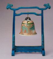 鐘仿青銅器造型,鐘頂留一小孔,鈕為藍釉瑞獸,自上而下共繪四層紋飾,上層冰裂紋地上以綠,藍,金彩繪八卦紋,第二層綠彩繪仰覆三角紋,腹部紅彩斜方回紋錦地上綠彩繪四獸面,獸面間繪上仰下覆式如意紋,下層紅彩冰裂味地上黃,黑彩繪陰陽魚紋各四個。
