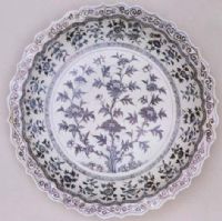 盤通體為蓮花瓣式。青花紋飾,盤心飾山石牡丹,里壁飾折枝花紋和回紋,口沿飾忍冬紋,外壁飾折枝花紋。此器中心紋飾以牡丹象征“春”,以山石象征“壽”,描繪自然流暢,與嚴(yán)謹(jǐn)?shù)牟季窒嗟靡嬲谩?/p>