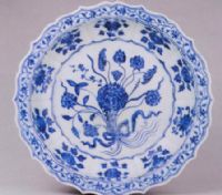 盤菱花口。青花紋飾,盤心飾束蓮紋,里外壁均飾折枝花紋,折沿飾纏枝花卉紋。外口沿下青花橫書“大明宣德年制”六字楷書款。此盤里心紋飾又稱“把蓮紋”,是宣德瓷器上獨具特色的裝飾。此器是宣德時典型器。