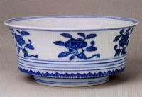 碗撇口,折腹。青花紋飾,外壁飾折枝花卉紋,壁下部有兩道凸弦紋,近足處飾蕉葉紋。碗心青花雙圈內(nèi)書(shū)“大明宣德年制”六字楷書(shū)款。此器造型端莊,紋飾細(xì)膩。
