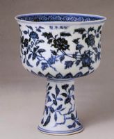 碗撇口,深腹,高足中空外撇。青花紋飾,里心飾束蓮紋,外壁飾纏枝牡丹、石榴、月季、菊花紋,近足處飾菊瓣紋,足柄飾折枝花卉紋。外口沿下青花橫書(shū)“宣德年制”四字楷書(shū)款。此碗上部取宮碗式,下承高足,顯得敦實(shí)別致。